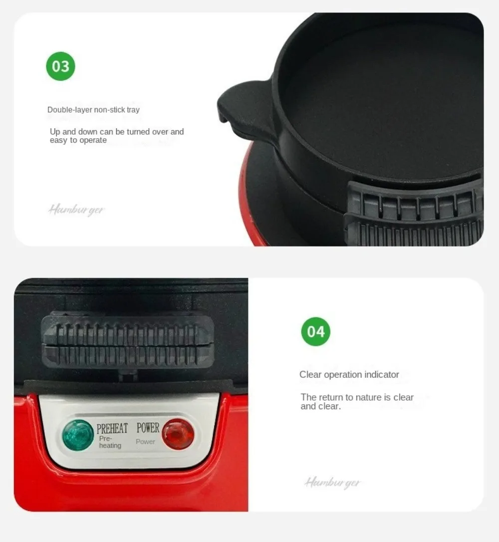 2. **Non-Stick Electric Mini Breakfast Maker**: This multifunctional burger machine is equipped with non-stick surfaces and can operate on both 220V and 110V power sources. It serves as a versatile appliance for making burgers, waffles, and eggs. The portable design and availability of US/EU plugs make it ideal for use at home or while traveling.